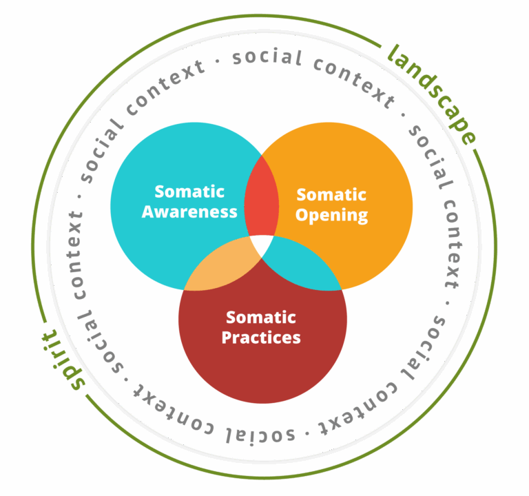 This graphic helps us to understand the various aspects of somatic transformation. Somatic Awareness develops our ability to feel and work with sensation, emotions, and aliveness in the felt senses. We learn to come ‘back into our bodies’ and live inside of our own skin, recognizing the information and wisdom there. We become more aware of others’ aliveness and feeling as well. Somatic Practices help us develop new skills that we can act on, making sure they don’t remain just a good idea. Through practice, we train new skills into our nervous systems so that we have these as a choice, even under pressure. New practices can include; centered boundaries, consent, requests, making offers/ proposals, somatic assessments, and more. Somatic Opening is deconstructing embodied habits and getting to heal and attend to what they have been taking care of. This makes spaces for a new practice to deepen and root. The broader circles of Social Context and Landscape/Spirit acknowledge the context and conditions in which all transformation is happening, and must be addressed in all levels of change.